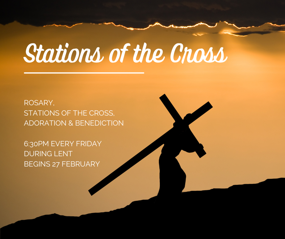 Starts with Rosary at 6.30pm, followed by Stations of the Cross, Adoration and Benediction.